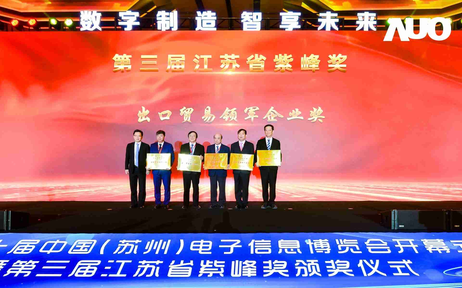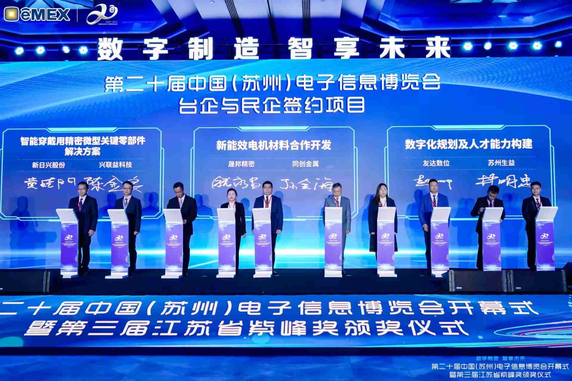 电博会开幕式当天也是第三届江苏省紫峰奖颁奖仪式,,,省台办、、工信厅、、、、商务厅、、、、苏州市相关领导均出席并颁奖。。。。该奖项为表彰对江苏高质量发展做出积极贡献的在苏企业,,,由江苏省政府专门设立。。。至成国际光电 (苏州) 总经理郭振明代表上台领奖,,,这也是至成国际苏州连续三次蝉联紫峰奖 出口贸易领军企业奖。。至成国际数位总经理赵丽娜女士,,,,也参与本次开幕式,,,上台为本地化赋能签署战略合作协议,,,,将优质服务资源集合、、、、下沉到更多细分行业,,,为更多地区的制造企业提供数字化转型服务。。。
